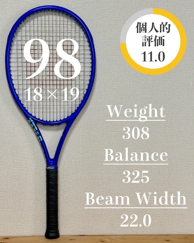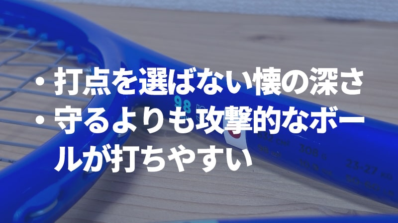 98インチのラケットの中ではボールの飛びは良好で、スピンはそこそこかかるといった感じ(フラットドライブ系)。